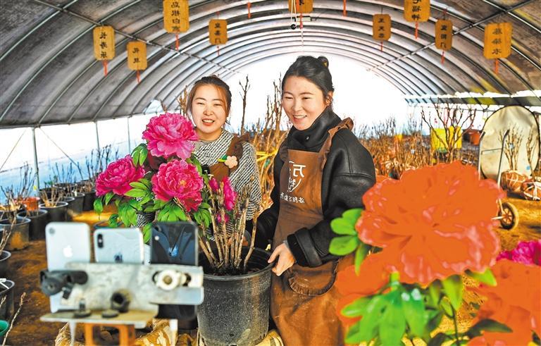 12月15日,河南省洛陽市土橋社區(qū)溫室大棚,花農(nóng)通過網(wǎng)絡(luò)平臺(tái)直播銷售催花牡丹。