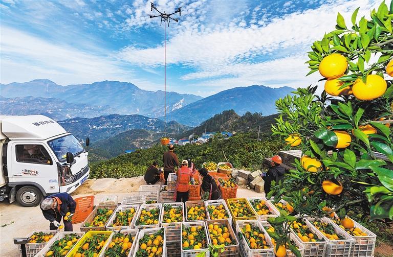 11月26日,湖北省宜昌市秭歸縣郭家壩鎮(zhèn)鄧家坡村,無人機(jī)飛手操作無人機(jī)吊運(yùn)鮮橙。該縣推動(dòng)“電商+供應(yīng)鏈+農(nóng)戶”發(fā)展模式,拓寬臍橙銷售路徑。