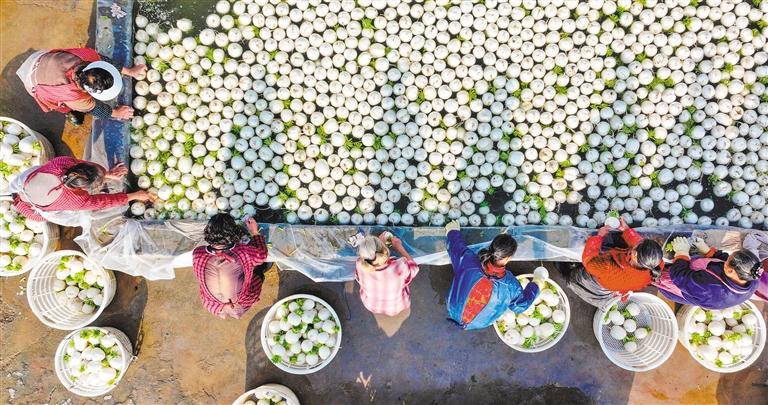 11月24日拍攝的重慶市墊江縣新民鎮(zhèn)七橋村蔬菜園,村民在清洗白蘿卜。該蔬菜園結(jié)合大棚控溫、滴灌、無土培育和智能監(jiān)管等技術(shù),日均可供應(yīng)新鮮蔬菜達(dá)5000斤。