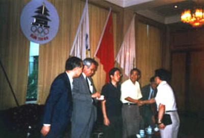 1993年謝長廷(黑色短袖衫,左三,五星紅旗下)、前民進黨主席姚嘉文(白發者,左二)、民進黨“立委”蔡同榮等人前往大陸訪問,在北京機場貴賓室內于五星紅旗下合影。(《中國時報》圖)
