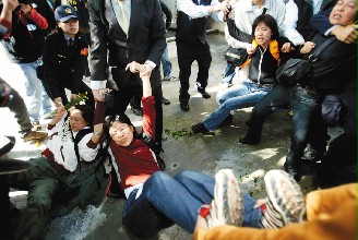 待陳水扁致詞快結(jié)束,提及臺北中正紀念堂從今天走入歷史時,又有兩位樂生青年大聲抗議。女學生在被安全人員架離時,一位參加活動的老伯伯,突然上前打了女學生幾巴掌,而穿著“人權(quán)志工”的老太太,竟然也在旁附合說“打的好”,引起現(xiàn)場一陣騷動。 (云鵬)