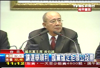國(guó)民黨主席吳伯雄會(huì)后強(qiáng)調(diào),國(guó)民黨在階段領(lǐng)票上讓步,以讓選舉順利進(jìn)行,但是“公投綁大選”,仍然是違反選舉公平性。