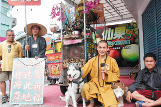 涉嫌性侵的姚姓和尚(右二)6年來帶著3名智障徒弟和流浪狗,徒步島內(nèi)各縣市販賣佛經(jīng)光盤。(聯(lián)合報圖)