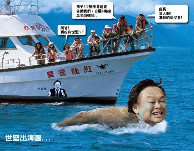 此外,連海報上的對話都成了網(wǎng)友展現(xiàn)KUSO(惡搞)的地方,上面寫著:“阿爸真的有世堅!”“孩子!世堅出海是要告訴我們,白爛加嘴炮是會倒霉的。”(周先)