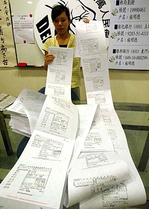 “百萬(wàn)人民倒扁運(yùn)動(dòng)”當(dāng)初募得巨款,工作人員展示大疊郵局劃撥單據(jù)。(臺(tái)灣“中時(shí)電子報(bào)”圖)