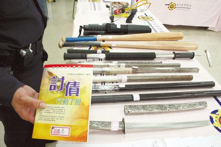 臺警方破獲暴力討債集團,逮捕10嫌。討債成員使用球棒、西瓜刀及小武士刀等工具,手上還拿著“討債行動手冊”。。ㄅ_灣《中國時報》圖片)
