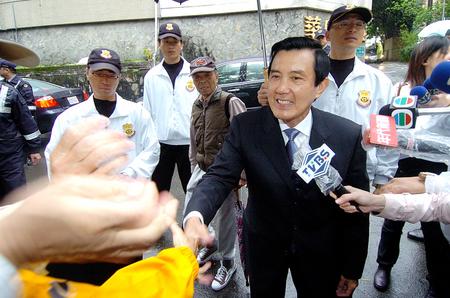圖為馬英九23日早上前往富德公墓祭拜父親,在寓所前和民眾握手。(臺灣《中國時報圖片》)