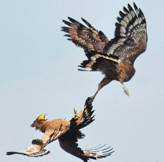 屏東縣海生館展示組的林清哲前天在關(guān)山觀夕陽的看臺(tái)上,用鏡頭捕捉到大冠鷲求偶的精彩互動(dòng)。(聯(lián)合報(bào)圖)