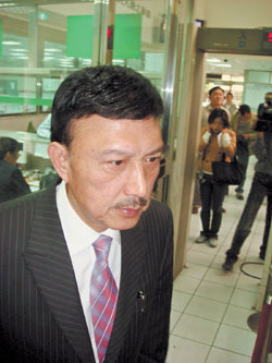 選戰期間余天遭控涉及組織犯罪、恐嚇、妨害名譽及違反“選罷法”等案,昨日前往板橋地檢署應訊。(臺灣《中國時報》圖片)