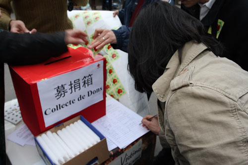 法國友人與法國華人華僑和留學(xué)生一起為四川大地震遇難者進(jìn)行祈禱。圖中為法國前總統(tǒng)希拉克的養(yǎng)