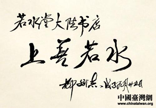 中國臺灣網9月27日消息  紀念海峽兩岸出版交流20年系列活動大陸代表團團長、新聞出版總署署長柳斌杰一行,9月25日上午赴若水堂大陸圖書高雄店參訪,柳斌杰署長親切會見了若水堂董事長宋東文并與之進行座談。宋東文對現階段臺灣地區簡體字圖書進口銷售經營現況進行了簡報。會見后,柳斌杰署長揮毫為若水堂題字:“上善若水”。