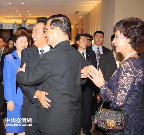 4日晚間,國民黨榮譽主席連戰在臺北國賓飯店宴請海協會會長陳云林一行。這是連戰與夫人在宴會廳入口迎接陳云林與夫人,兩位老朋友在臺灣熱情相擁。(田云鵬 攝)