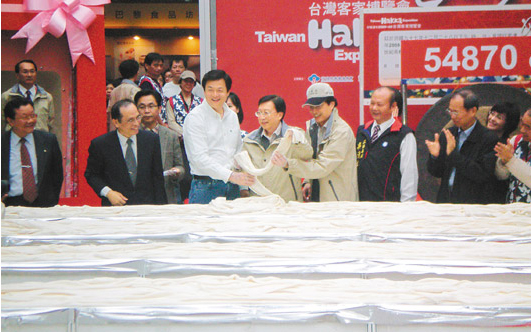 報(bào)道稱,臺(tái)當(dāng)局行政部門主管劉兆玄昨天下午參加最長(zhǎng)客家粄條見證活動(dòng)。這條長(zhǎng)548.7米的客家粄條,是由新竹縣竹東鎮(zhèn)客家米食中心用了700臺(tái)斤米,動(dòng)員30名員工、花兩天兩夜制作,在會(huì)場(chǎng)以U字型排列。