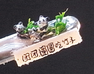 據臺媒報道,從事微雕已經29年的臺灣微雕家陳逢顯,繼上月用樹脂創作出世界最小的大熊貓后,又花費20個工作日以頭發創作出世界最小的大熊貓,作品取名“團團圓圓吃竹子”。作品中“團團”“圓圓”表情快樂的吃著臺灣產的竹子,栩栩如生,令人嘆為觀止。陳逢顯表示,這個作品象征臺灣土產的竹子也能讓“團團”“圓圓”享用后,身體健康又聰明可愛,和臺灣民眾打成一片。