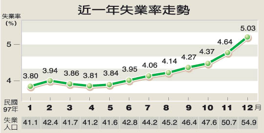 報道稱,去年12月失業(yè)率創(chuàng)新高,其中,有多達25萬名的失業(yè)人口,因關廠歇業(yè)丟工作,幾乎回到上一波經(jīng)濟衰退(2002年)期間的水準,景氣的快速衰退,是導致勞動力市場每況愈下的主要原因。