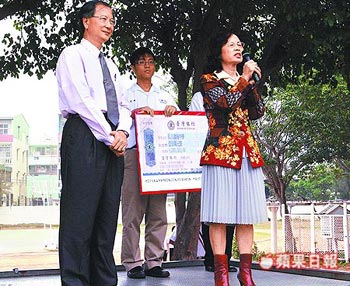 中國臺灣網2月27日消息 據臺灣《蘋果日報》報道,臺灣一名初中退休老師,昨捐出100萬元(新臺幣,下同)給臺南市私立瀛海中學,做為清寒學生獎學金。她上臺致辭時一度脫稿演出,點名陳水扁,想呼吁陳水扁將海外賬戶金錢匯回臺灣做善事,校長擔心太過政治化,請師生以掌聲中斷她的致辭。
