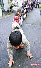許多小學(xué)生由老師陪同鉆轎底,希望功課進(jìn)步、身體健康。來源:臺灣《蘋果日報》
