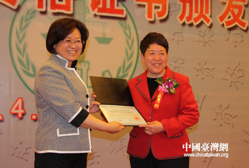 國家司法考試司司長丁露為獲得律師職業資格的臺灣居民頒發資格證書。(中國臺灣網 張弛 攝)