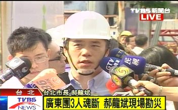 廣東旅客游覽車臺北遭起重機吊臂砸中,2死1命危。圖為臺北市長郝龍斌赴現場勘察。來源:臺灣TVBS電視臺