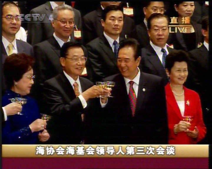 中國臺灣網4月26日南京消息 海協會會長陳云林與臺灣海基會董事長江丙坤26日下午三時許在南京紫金山莊會議中心紫金廳簽署《海峽兩岸空運補充協議》、《海峽兩岸金融合作協議》、《海峽兩岸共同打擊犯罪及司法互助協議》等三項協議后,與現場觀禮的兩會代表共飲香檳,舉杯慶祝簽署協議成功。