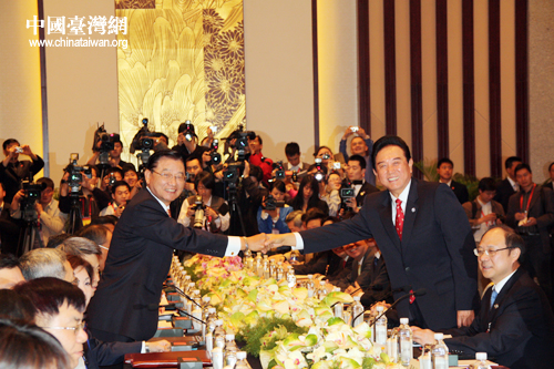 陳云林與江丙坤握手。4月26日上午9時,海峽兩岸關系協會會長陳云林與海峽交流基金會董事長江丙坤第三次會談在南京紫金山莊正式舉行。(中國臺灣網 鐘寶華 攝)