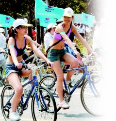 2009年“臺灣自行車日”活動昨天上午舉行,車友們花盡心思呈現(xiàn)出最獨特的造型,包括穿著清涼的辣妹兵團。圖片來源:臺灣《聯(lián)合晚報》