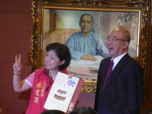 國民黨“立院”黨團(tuán)書記長(zhǎng)楊瓊瓔送上在場(chǎng)所有人簽名的賀卡。(圖片來源:人民網(wǎng))