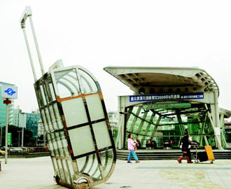 內湖線連通臺北松山機場,讓兩岸一日生活圈的夢想儼然成形。圖為松山機場站門口的裝置藝術“大旅行時代”。(圖片來源:臺灣《聯合報》)