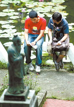 2009年臺灣指考第2天考試,2位考生在孔子像旁做最后沖刺。圖片來源:臺灣《中國時報》