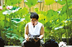 臺灣指考第二天,悶熱的天氣讓人昏昏欲睡,一名考生在荷花池邊忍不住打起哈欠,但手中仍拿著書不放。圖片來源:臺灣《中國時報》