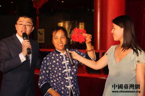 民間剪紙藝術(shù)大師梁春蘭向臺(tái)灣嘉賓贈(zèng)送剪紙作品(中國臺(tái)灣網(wǎng) 高琿 攝)