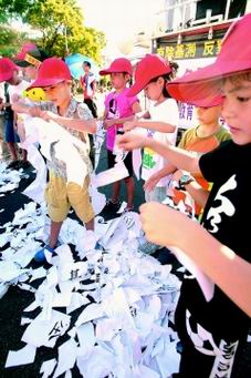 臺灣家長團(tuán)體昨天在臺北市發(fā)起“我要免試的12年義務(wù)教育”大游行,許多小朋友跟著爸媽上街頭,一起撕“準(zhǔn)考證”。(來源:臺灣《聯(lián)合報》)