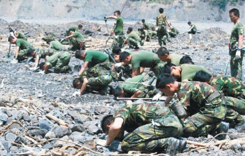 臺軍為尋找罹難者遺體,連鼻子都用上了,為防止疏漏,士兵排成一列趴在土石上一寸寸地聞,遇有異味再開挖。來源:臺灣《聯合報》
