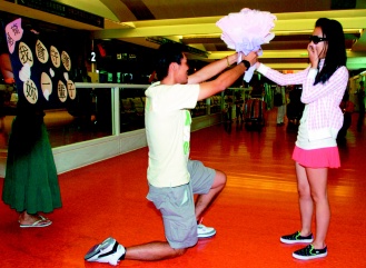 據(jù)臺灣《聯(lián)合報》報道,住在桃園縣的福至(左)與女友惠琦(右)愛情長跑多年,日前惠琦與親友外出旅游,福至找來同學兼死黨策劃到機場浪漫求婚,當惠琦走進機場大廳,福至獻上一束鮮花,然后再當著所有旅客的面單膝跪地求婚,完惠琦驚喜之余含羞點頭。