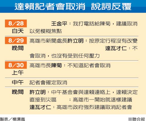 達賴記者會辦不辦成30日焦點,陳菊30日上午受訪時還堅稱記者會照舊,直到達賴方面表示取消后,才對外說“直赴災區原就是她的建議行程”,引起外界質疑是高雄市府事后“自圓其說”。