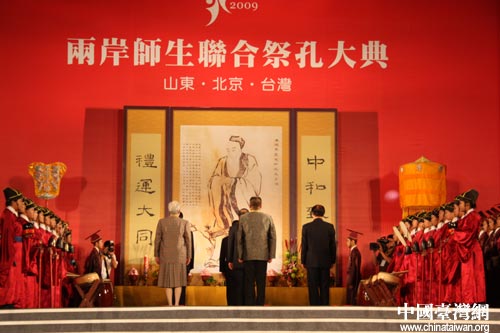 大典以兩岸學生共同呈現(xiàn)《學做人、學做事、學擔當天下》的古今師生對話拉開序幕,活動中來自孔子故里山東、北京、以及臺灣忠信學校共108位學生擔任禮生、佾生、樂生。親民黨主席宋楚瑜主禮正獻后,兩岸師生同唱孔子紀念歌。