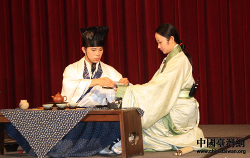 北京孔廟和國子監(jiān)博物館工作人員為兩岸師生表演孔子茶道。(中國臺灣網(wǎng) 李杰 攝)