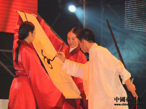 孔廟古琴教師朱慧鵬為兩岸師生作了太極舞劍和古琴表演,他表示,孔子倡導(dǎo)“六藝”,希望兩岸師生以傳統(tǒng)文化為紐帶,促進(jìn)兩岸青少年的了解和友誼。他在舞劍表演時,一手持劍一手書寫漢字“和”,就是希望兩岸共建和諧中華。
