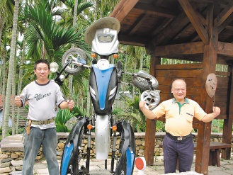 魚池鄉(xiāng)武登村民持續(xù)整理光明小學(xué)校園,還以廢摩托車創(chuàng)作變形金剛,村長歐慶祥(右)說:“村民的努力終于被看見”。來源:臺灣《聯(lián)合報(bào)》