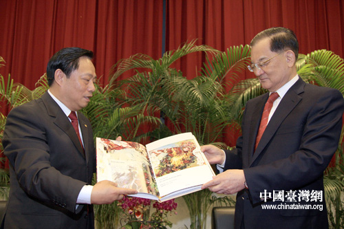 連戰(zhàn)向梁國揚贈送臺灣特產茶葉。(中國臺灣網 田云鵬 攝)