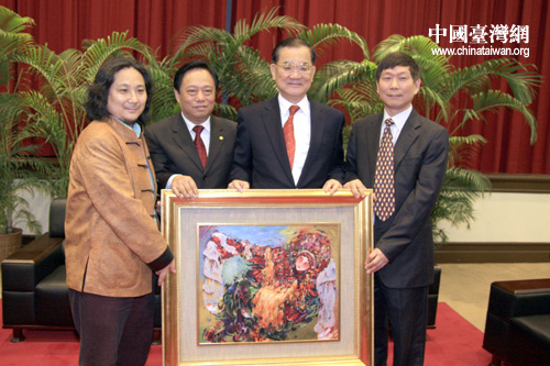 梁國揚向連戰(zhàn)贈送國粹油畫精品《貴妃醉酒》的繡品。(中國臺灣網 田云鵬 攝)
