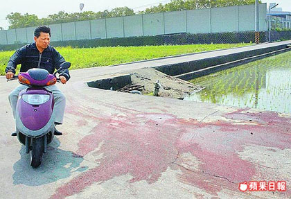 劉彥聰在路上被砍死,地上留下大灘血跡,行人途經(jīng)紛紛走避。 來(lái)源:臺(tái)灣《蘋(píng)果日?qǐng)?bào)》
