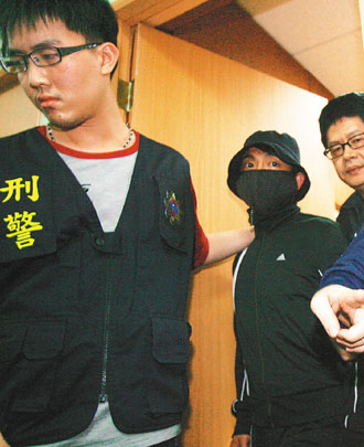 藝人大炳(余炳賢)(中)昨天又因涉嫌持有毒品被逮捕,口罩顏面,回避采訪。圖片來源:臺灣《聯合報》