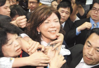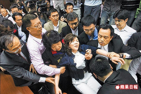 臺(tái)“立法院教育及文化委員會(huì)”上午排定審查陸生來(lái)臺(tái)相關(guān)“法案”,擔(dān)任會(huì)議主席的國(guó)民黨籍民意代表趙麗云(左)要宣布會(huì)議開(kāi)始,卻被民進(jìn)黨籍民代管碧玲(右)用力抱住,兩人抱成一團(tuán),表情痛苦。圖片來(lái)源:臺(tái)灣《聯(lián)合報(bào)》