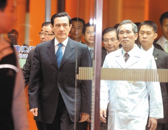臺(tái)灣地區(qū)領(lǐng)導(dǎo)人馬英九(左)昨晚赴臺(tái)大醫(yī)院探視國(guó)民黨籍趙麗云,他神情凝重,譴責(zé)民進(jìn)黨暴力干擾議事。圖片來(lái)源:臺(tái)灣《聯(lián)合報(bào)》