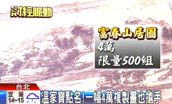 溫家寶總理提過分藏兩地的《富春山居圖》復制版一幅賣4萬元新臺幣,依然熱銷。 來源:臺灣TVBS電視臺