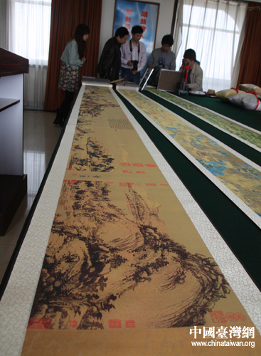 中國臺灣網4月26日湖州消息 一幅名卷展世博,兩岸深情盼團圓。25日,由人民網、中國臺灣網等23家網絡媒體組成的“全國知名網絡媒體浙江行”記者一行,走進了為世博會研制永久陳列絲綢國寶的絲綢之路集團,在60多件獻禮世博會的絲綢精品中,兩卷合一的絲綢織錦畫長卷《富春山居圖》引人注目。