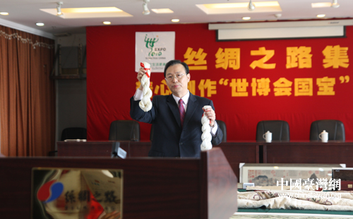 絲綢之路集團董事長凌蘭芳介紹在倫敦首屆世博會獲得金牌的湖州輯里湖絲仿制件與現代工藝制作的湖絲(中國臺灣網 李典典攝)