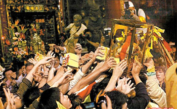 中國臺灣網(wǎng)4月27日消息 綜合臺灣媒體報道,臺灣臺中縣大甲鎮(zhèn)瀾宮媽祖340余公里繞境活動前日結(jié)束,據(jù)鎮(zhèn)瀾宮估計,今年參與繞境人數(shù)約120萬、香油錢約2400萬元(新臺幣 下同),金牌數(shù)更是達到1400多面,創(chuàng)下新高。
