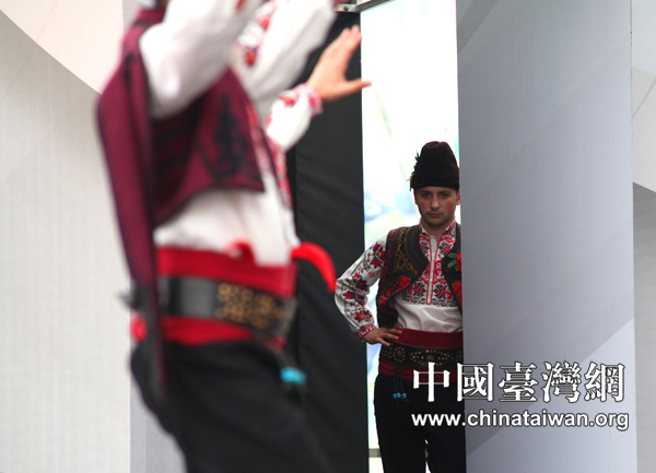 中國臺灣網6月11日上海消息 6月11日,一名保加利亞舞者一邊欣賞同伴的表演,一邊等待上場。當天,來自保加利亞的Trakia歌舞團,在上海世博園歐洲廣場為游客獻上民族歌舞表演。(中國臺灣網 田云鵬 攝)